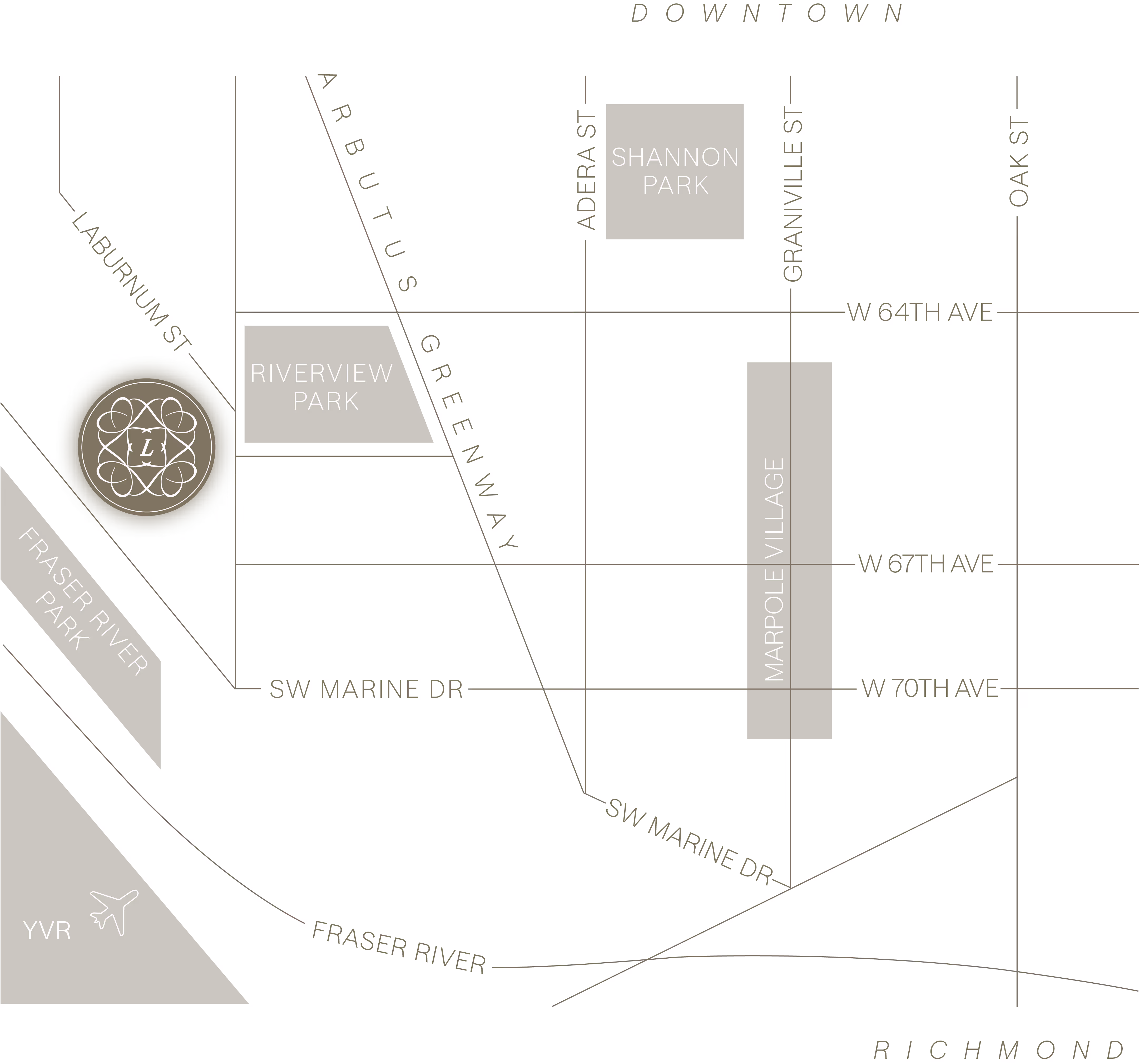 Life at Laburnum unfolds beside Riverview Park, surrounded by established schools and tree-lined streets. The Canada Line is minutes away, linking home to downtown and the airport with ease.