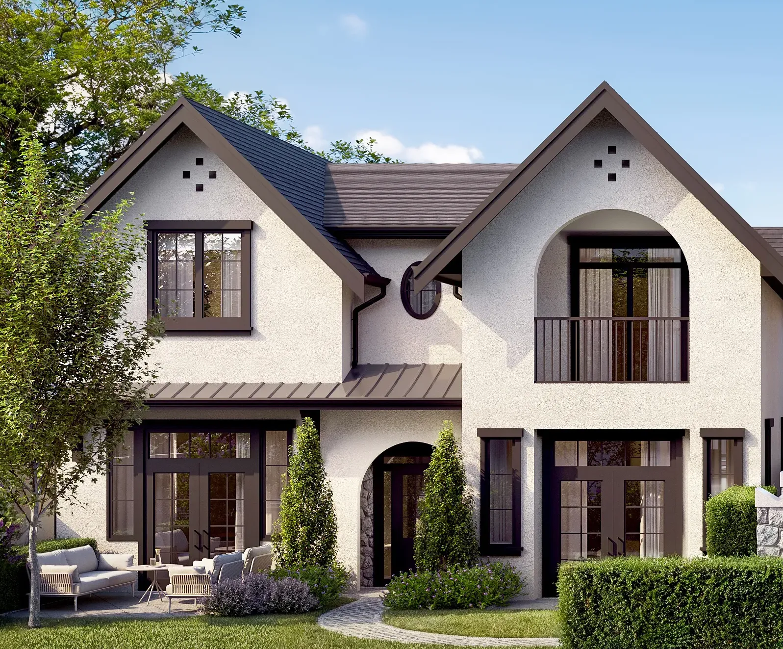 Light and shadow play across textured façades, giving each home a composed and enduring presence.