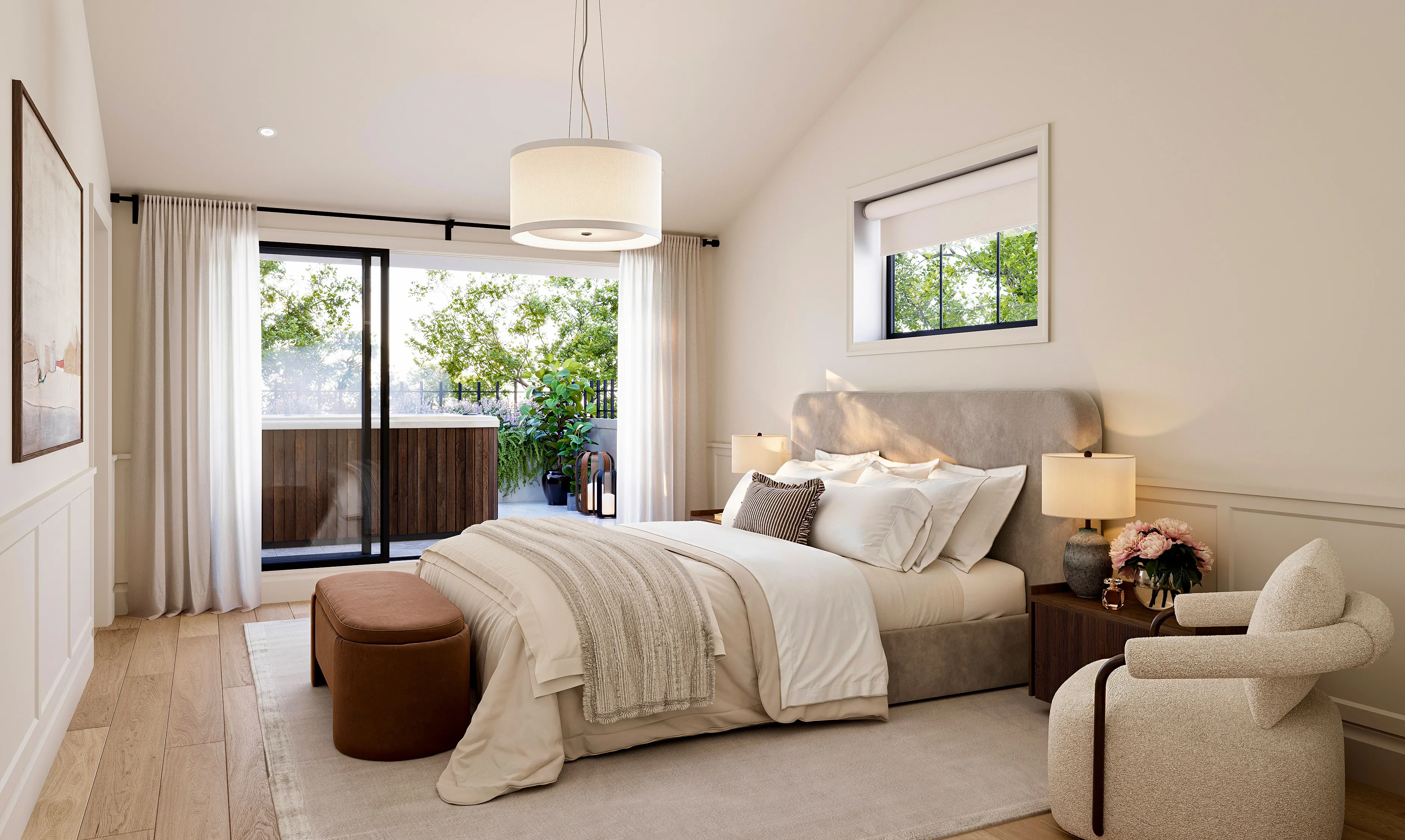 The primary suite opens to a private deck and ensuite, drawing in morning light and calm views.