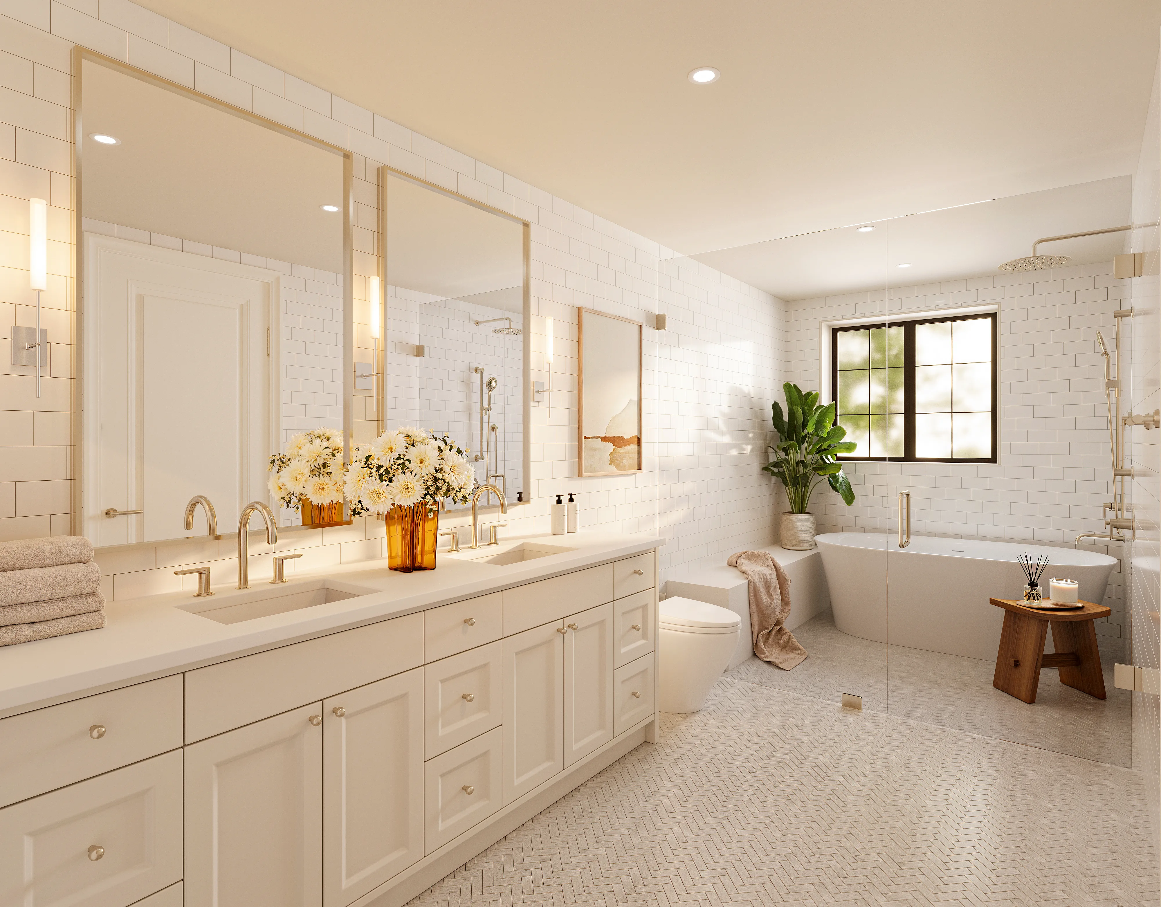 Stone and herringbone tile floors add texture and depth, while subtle metallic details introduce warmth and balance.